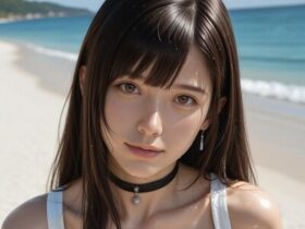 純白のサンドレスが、美女のナイスバディを優しく包み込む。その清楚な姿は、まるで楽園から現れた天使のようです。しかし、首元に輝く黒チョーカーは、その純粋さを拘束し、禁断の欲望を呼び起こすコントラスト。白い布地と黒い装飾品が…