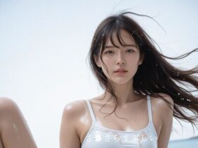 【太陽と砂、白く弾ける開放感。】寄せては返す波の音が心地よい「海辺」。乾いた砂の上に腰を下ろした彼女は、一点の曇りもない「白いビキニ」を纏っています。砂浜に直接「座って開脚」するその姿は、あまりにも無防備で、そして圧倒的… -