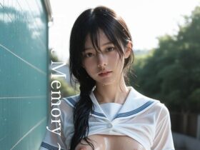 蝉の声が止み、白い制服の清涼感だけが残る季節の変わり目。彼女は、もう二度と戻らない青春の日々を、低い位置で静かに結んだ髪で表現している。白いシャツに透けるのは、夏の太陽を浴びた肌の、儚い残像。「これで、終わりだね」諦めと… -
