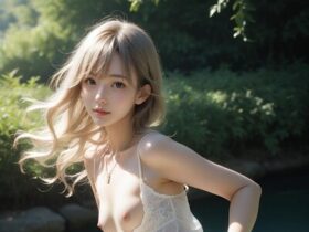 ひっそりと静まり返った池のほとり、陽光を透かす金髪の少女が、水面を見つめて佇みます。水滴を吸って肌に張り付く白いキャミソールが、清冽な風景の中で強い背徳感と、触れれば壊れてしまいそうな危うさを生み出します。これは、澄んだ…