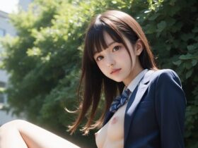 木漏れ日が地面に揺れる公園の片隅、古びたベンチに腰を下ろしたショートカットの少女。規律正しい制服の胸元を押し上げるような豊満な膨らみが、静かな午後の空気の中で、隠しきれない柔和な存在感と、どこか春を待つ蕾のような生命の息… -